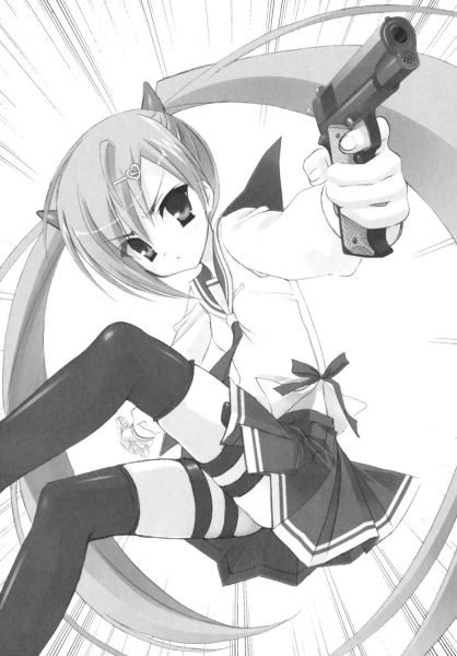 她像荡秋千一样晃动身体,将身体转成L形,接着右、左。少女从双脚大腿上的枪套,拔出一银一黑的大型手枪。