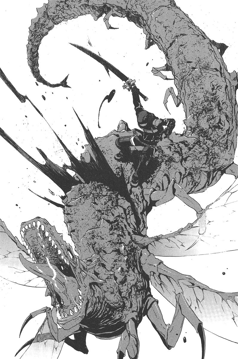 炼金钢再次咬合,这次向脚下的污染兽的胴体砍去。刚才的污染兽是纵向,而这次则是横向地砍成两半了。雷冯站着的腹部先落下了。连接着翅膀的上半身还向着前方前进着,不过也慢慢地随着翅膀的速度减慢而降下了。