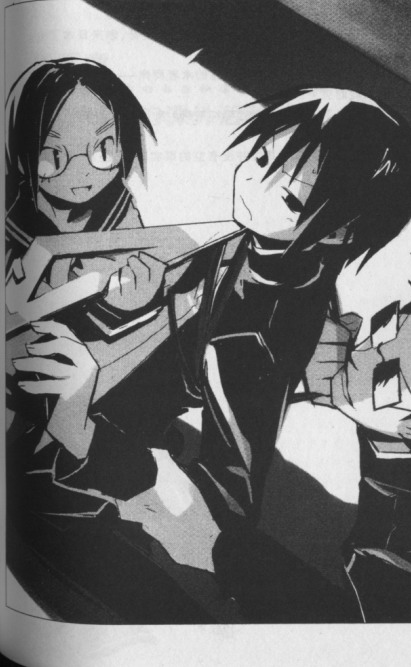塩原喊叫着,并拿出数学老师上课时所使用的大型三角板,瞪视着京介。刚才碰面时好像只有看到她拿着捕虫网而已,她到底是把三角板藏在哪里?对京介来说这是个谜。