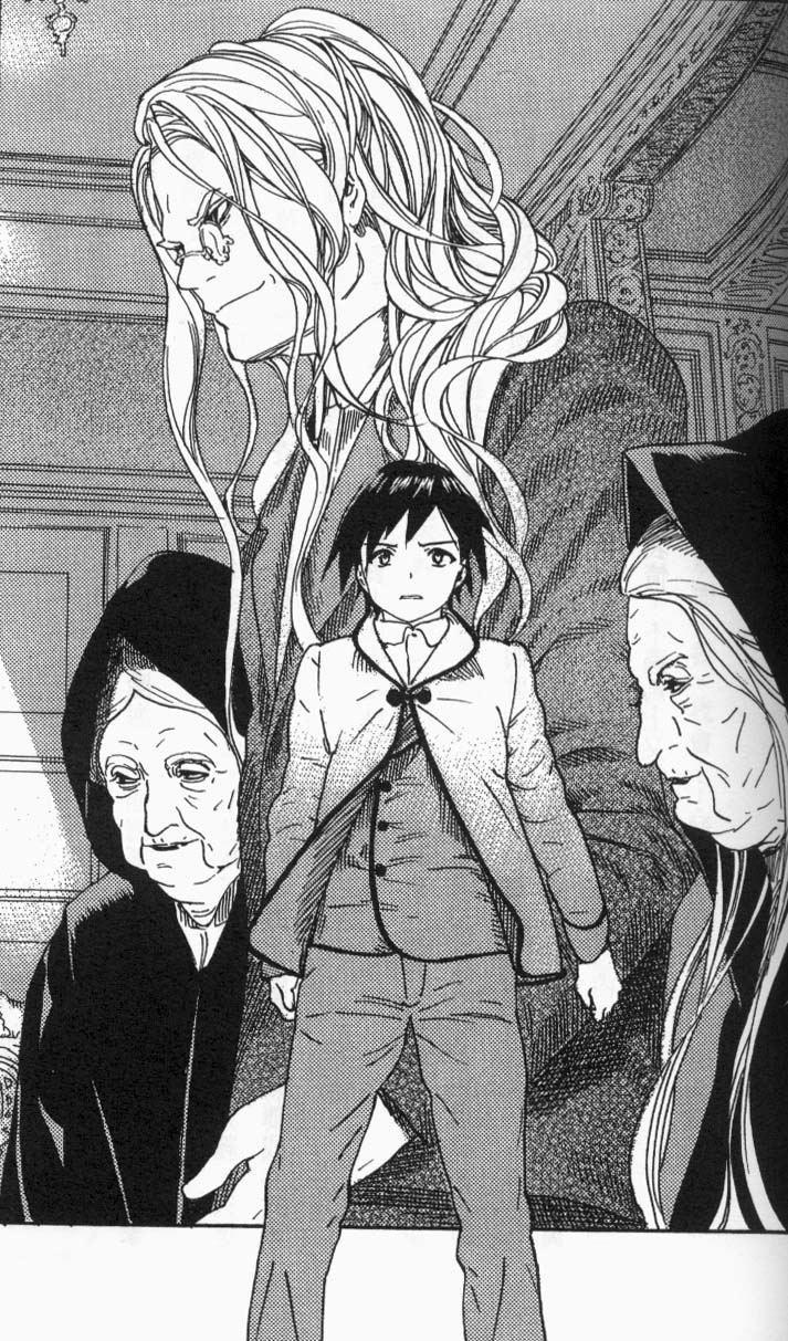 男子的左右是真正的老太婆——名叫卡蜜拉和摩瑞拉的费尔姐妹,像是保护男子一般站在身旁,蓝眸直盯着一弥。