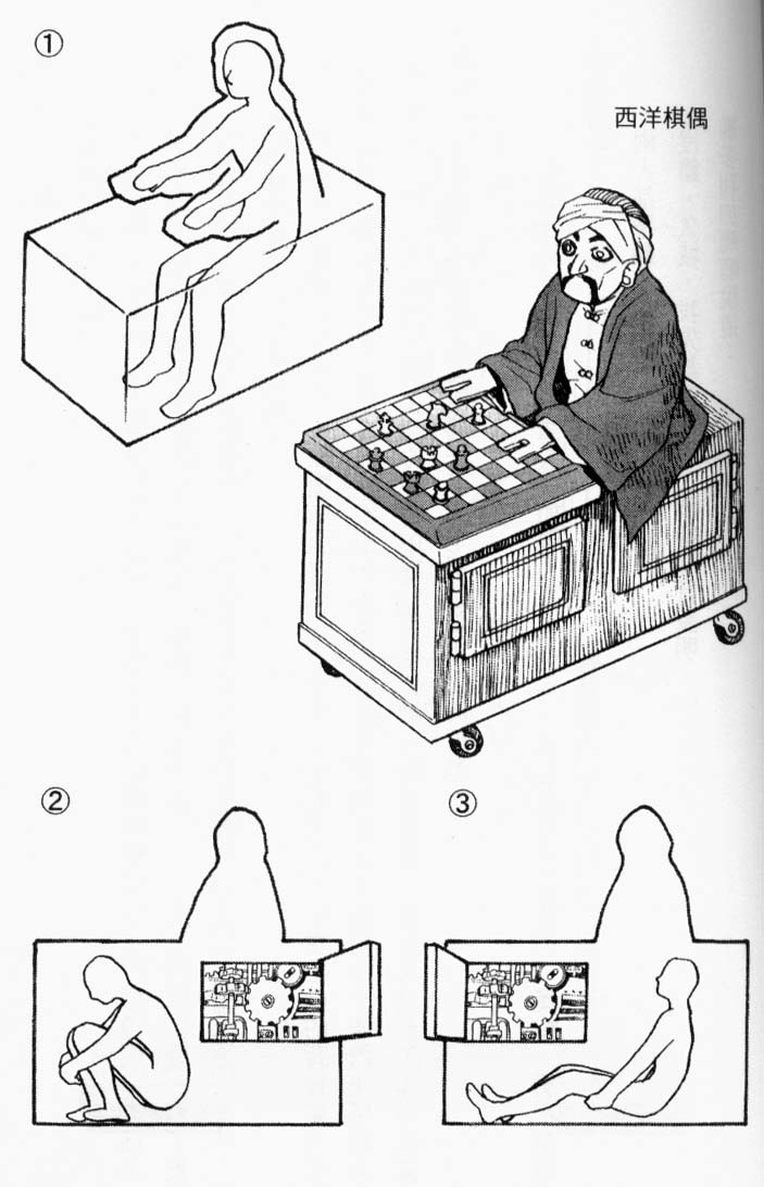 「打开左侧的门一看,只看到里面塞满机械——这应该是可以移动的。当时身形娇小的柯蒂丽亚就藏在右侧(③)。然后一打开右侧的门时,就把机械向右移动,藏身左侧(②)。等到需要用到西洋棋偶的人偶,就将上半身套入人偶里面(①)。如此一来,她便能藏身在小箱子里面当成行李,前往任何地方。即便是敌人据点〈别西卜的头骨〉也不例外,就好像小型的特洛伊木马。等到外出的时候就利用和自己长得一模一样的女儿,也就是我也在这里的这一点,伪装成我的模样出现,顺利取回遗物箱。」
