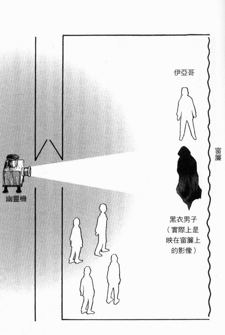 「当时的房门大开,想必是幻灯机放在隔着走廊的另一侧房间,朝着站在前方的伊亚哥放映幽灵影像。就在毒药在伊亚哥身上蔓延,开始感到痛苦的同时播放,然后在倒地之时停止,接着关上房门……你还记得当时从走廊对面传来关门的声音吗?」