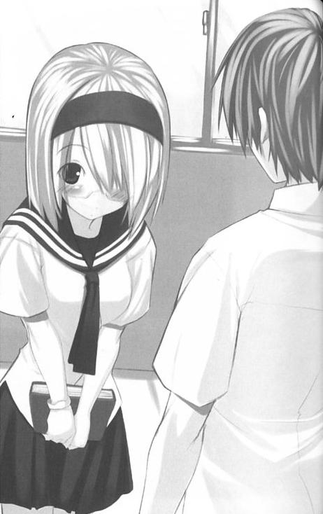 虽然我已经尽全力冲到二年四班的教室,但很不幸我还是迟到了。第一节课早就已经开始,除了我之外的同学都早就坐在位子上,以严格著称的古文老师不高兴地瞪着我,无言地指着黑板命令我「把空格处的汉字读音填上去」,我虽然硬着头皮作答,但直到第五次才完全正确。