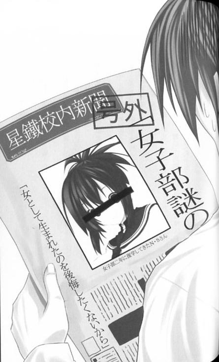 我虽然快昏倒了,不过还是忍着想死的心情看着那些文字,新闻内容是「女子部二年级复学生N·S同学」人虽然漂亮,但却对男生没兴趣,「该不会讨厌男生吧本报突击采访班试着对她进行专访」「嗅到一股百合的气息」,上面还仔细附上「所谓百合就是女人间恋爱的一种」的说明。