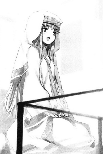 这种衣服叫什么来着?修道服?反正就是教会修女穿的那种衣服。看起来就像是一件长度到达脚踝的连身洋装,但是头上的帽子却有别于一般,是用一块布包起来的。但是一般修道服应该是黑色的,而这个少女身上穿的修道服却是纯白的。质料应该是丝质吧,再加上修道服的每个角落都有金色的刺绣,所以即使是同样剪裁的衣服,看起来的感觉就跟一般修道服完全不同。简直就像是暴发户最喜欢的那种画了金线的西式茶杯。